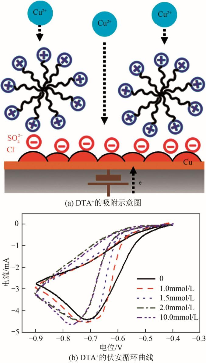 针对含长链烷基的铵离子,研究表明其在阴极表面的吸附和对铜电沉积的阻碍机理与仅含氨基时略有不同。Jo等发现十二烷基三甲基铵阳离子(DTA+)在阴极铜表面上会形成聚集体,并以聚集体的形式通过外圈正电荷吸附在带负电荷的阴极界面上,如图9(a)所示。其研究也确定了DTA+能够充当铜电沉积的抑制剂,增大阴极极化[图9(b)],可以降低表面粗糙度,并且不会作为杂质结合到沉积物中。