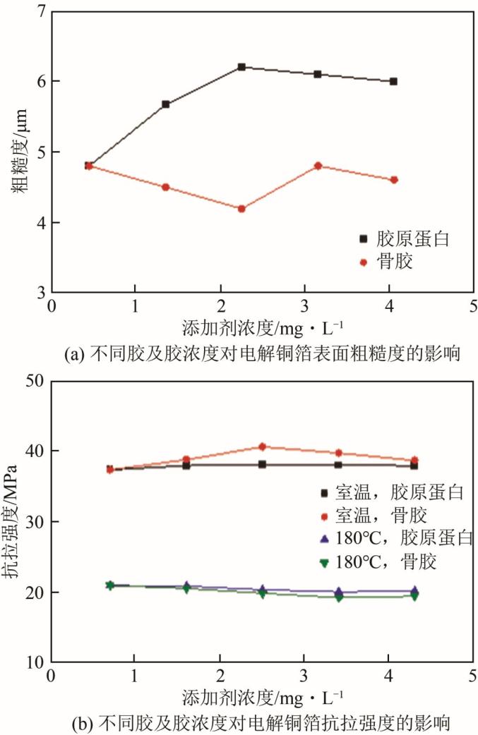 图10 不同胶及胶浓度对电解铜箔表面粗糙度和抗拉强度的影响聚丙烯酰胺(PAM)对铜箔粗糙度的影响属于前者,Fabian等的研究结果表明,聚丙烯酰胺可以使铜箔镀层更光滑致密,并在65℃时显著降低表面粗糙度。而Lin等对比了不同流速下有JGB添加剂和无添加剂的情况下制得的电解铜箔表面粗糙度(包括轮廓的算术平均偏差Ra和轮廓的最大高度Rz),如表1所示,发现在低流速下,JGB的加入反而会使铜箔粗糙度增大,而流速增大后,粗糙度则会明显减小。其原因可能是JGB带正电的官能团会选择活性位点吸附,而在铜沉积过程中,活性位点的位置会不断发生变化,因此需要有效的添加剂吸附脱附过程。因此,电解液流速低时,添加剂的脱附和迁移较为困难,分布不均匀,直接导致了铜晶粒局部生长过大,粗糙度升高。
