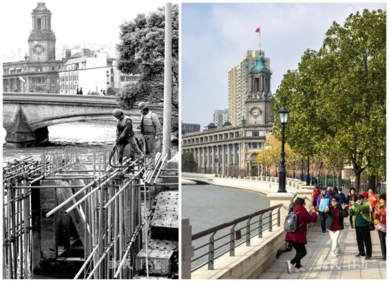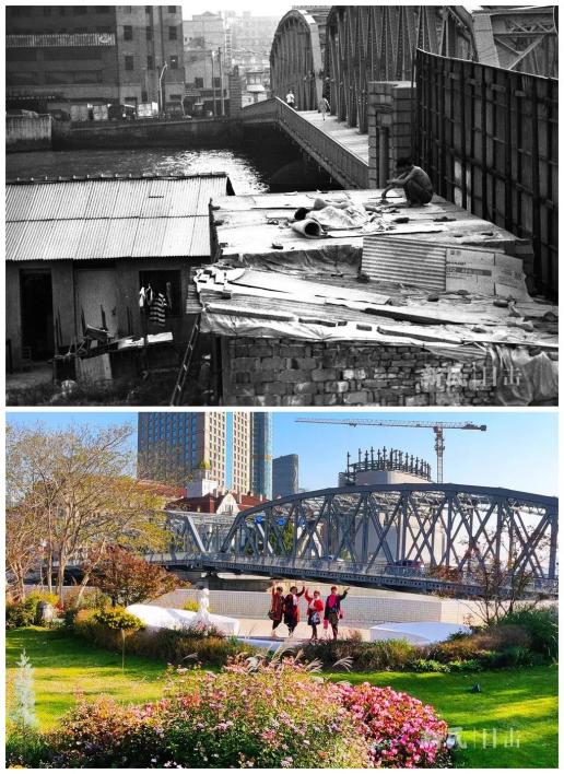 1982年7月vs2021年12月在一张摄于1982年7月的照片里,苏州河与黄浦江交汇处的外白渡桥边,有一排私自搭建的危房简屋,环境脏乱。如今,该区域按“重现风貌、重塑功能”的整体思路,正全力打造成多功能、高品质、国际化的文化区和历史风貌保护区。