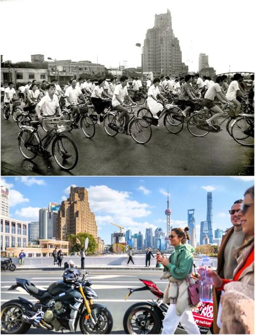 1984年8月vs2021年12月距离外白渡桥约300米的乍浦路桥上,也有不一般的风景。中国曾被称为“自行车王国”,在那个罕有私家车和电瓶车的年代,上海市民热衷于骑着“永久”“凤凰”穿梭于大街小巷。在1984年8月的一个早高峰,乍浦路桥上清一色自行车大军“堵车”场面,今已难觅,取而代之的是一座“看得见风景的桥”。