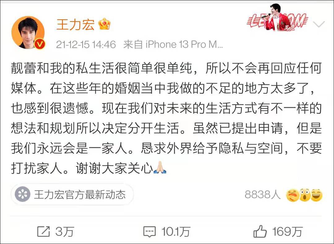 王力宏与李靓蕾于2013年正式宣布结婚,8年婚姻里,李靓蕾生了3个孩子,2个女儿分别为7岁和5岁,小儿子3岁。近日,有媒体爆料称王力宏离婚,其本人15日在微博证实,自己已经提出离婚申请,双方“对未来的生活方式有不一样的想法和规划”,恳求外界给予隐私和空间。