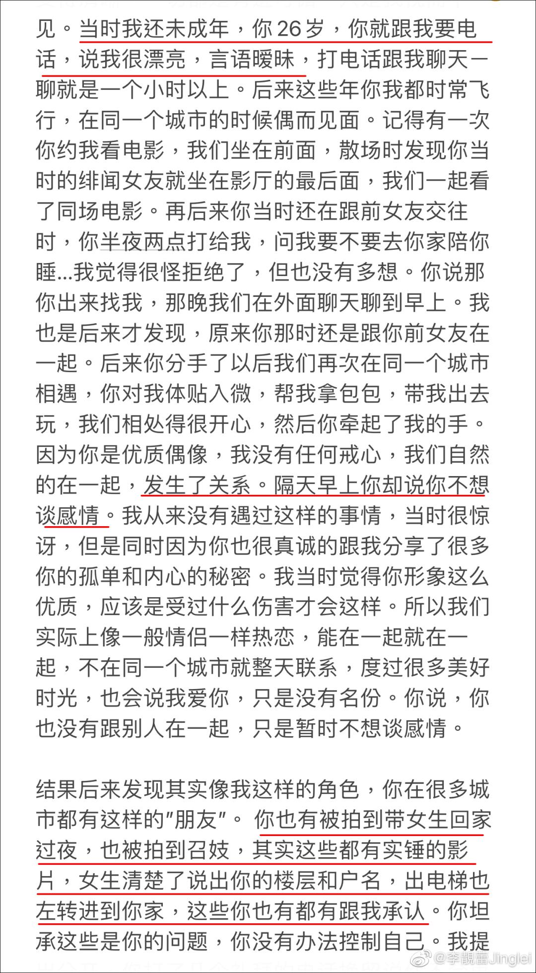 李靓蕾还爆料称王力宏私生活不检点,自己尚未成年时,王力宏就主动撩拨,言语暧昧;后来两人发生关系后,王力宏却在隔天早上称自己不想谈感情。李靓蕾还爆料王力宏婚前出轨、召妓嫖娼等种种劣迹,这些都是王力宏亲口向其承认之事。婚后,王力宏仍然不知收敛,和情人继续来往,拍大尺度照片,甚至还将其邀请到家中聚会。李靓蕾还称王力宏婚后依然有嫖娼行为,他甚至还记录了召妓对象的特征。