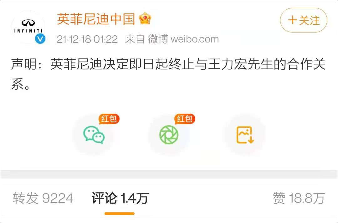 李靓蕾发文后很快引发舆论热议,王力宏代言的汽车品牌英菲尼迪连夜宣布与其解约。值得一提的是,此前一天,英菲尼迪刚刚官宣王力宏成为品牌代言人,时间仅仅过去了30多个小时。