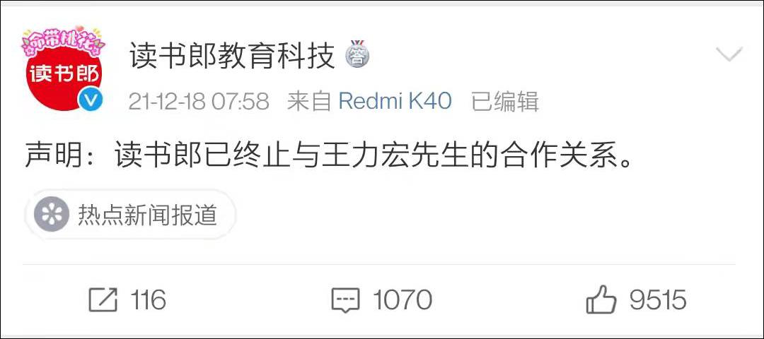 而教育科技品牌读书郎也于今早7:58宣布与王力宏终止合作关系。