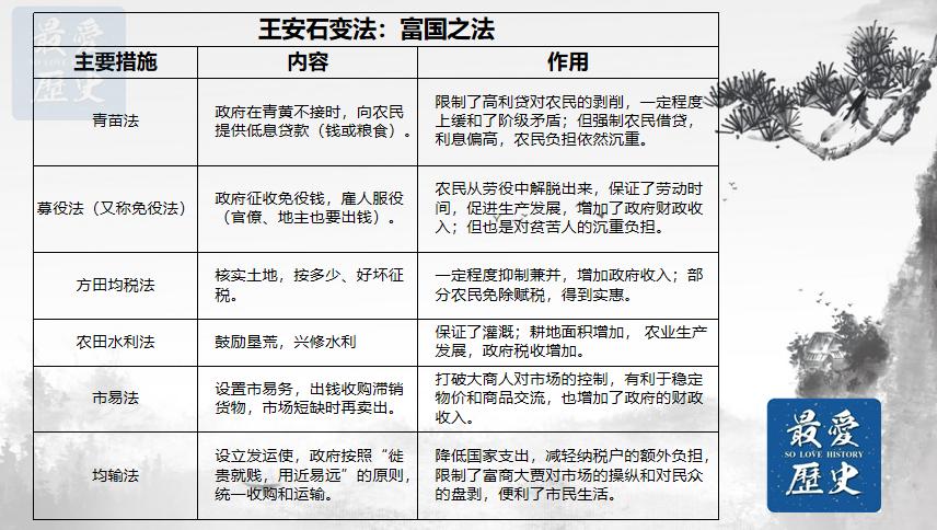 王安石以均输法、青苗法、农田水利法、市易法、免役法等富国之法,以及置将法、保马法、军器监法等强兵之法作为后盾,迅速改变了宋朝中央财政空虚的局面。