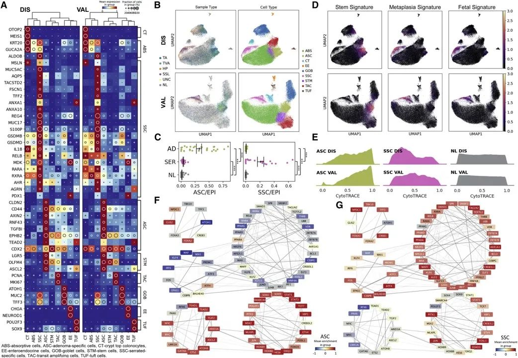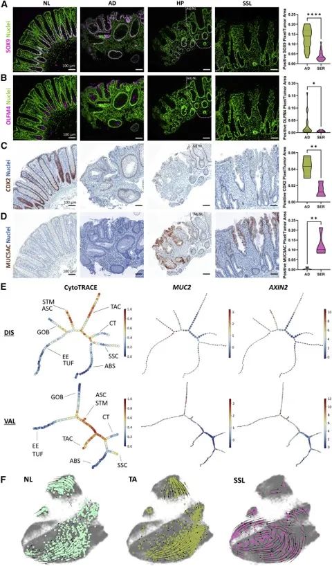 不同类型息肉的免疫荧光和免疫组化结果表明,干细胞标志物OLF M4和SOX9在传统腺瘤中高表达,而SSC细胞群高表达的MUC5AC仅在不同类型锯齿状息肉中高表达(图A-D)。有意思的是,MUC5AC阳性的新生细胞常位于肠隐窝顶部,而MUC5AC阴性正常细胞往往在隐窝底部。结合一些肠腔表面样本及溃疡性结肠炎样本的MUC5AC高表达,他们推断肠腔表面反复刺激导致细胞化生进一步形成不可修复损伤可能是导致锯齿状息肉形成的原因。进一步,团队利用p-Creode完成单细胞数据中观测的所有亚群细胞命运的过渡轨迹推断,并利用RNA速度(RNA velocity)展示出ASC起源与干细胞,而SSC细胞群更可能起源于非干细胞(图3E-F)。
