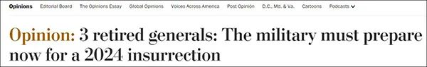 “临近国会骚乱一周年之际,美军所有前高级军官越来越担心2024年大选可能引发的后果以及美军内部潜在的致命混乱,这些都将导致全体美国人处于严重危险之中。”他们说道,“一想到下次政变(coup)还可能成功,我们就无比寒心。”
