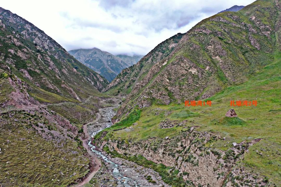牦牛沟烽火台 俯拍顺着右侧的水关河上游望去,在约有一两公里处山腰的一块绿色的草坪上就是扎墙湾烽燧,在其下方应该就是水关河大口子关口了。