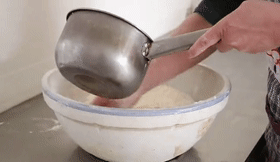 1、两碗面粉倒在面盆里(根据人数增减),最好是和面专用的瓷盆。