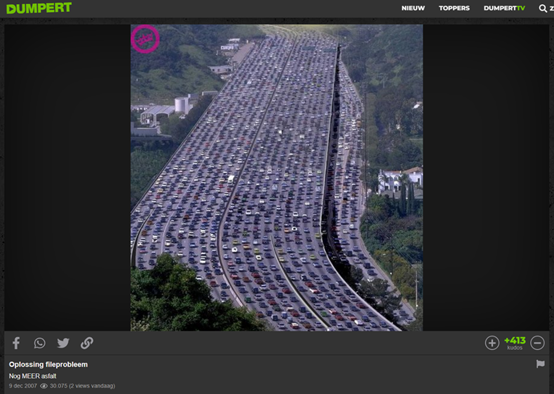 使用谷歌搜图工具反搜相关图片,可知此图在互联网上传播的时间其实已长达十余年。可查询到的最早记录显示,2007年12月9日,一家荷兰在线视频平台和图像共享网站Dumpert上传了这张图片,配文称“解决堵车问题,(需要)更多的沥青”。
