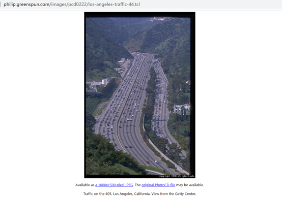 该图片右下角标注有“copyright 1998 philg@mit.edu”字样,意味着此图拍摄于1998年,版权归格林斯庞所有。图说信息与rc在bricoleurbanism发布的文章内容基本一致,显示拍摄的是加利福尼亚州洛杉矶405号公路的交通情况,而非中国“110号公路”。