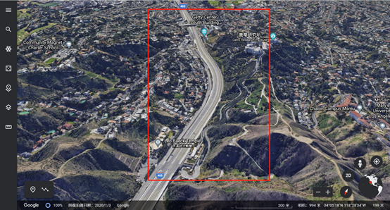 在谷歌地球上搜索盖蒂中心,可以进一步确认此地确实在美国405号洲际公路旁,其所在地地势较高,能够俯瞰公路全貌。结合道路弯曲形状、周边植被情况和拍摄视角,能够在谷歌地球上找到图片显示的道路路段(下图中红框显示区域),原图左上方的白色建筑经推测有可能是加州的改革犹太教堂(Leo Baeck Temple)所在地。