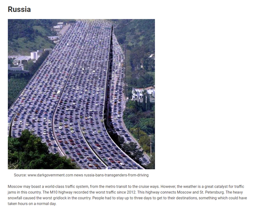 例如,一家名为Carro.sg的网站在介绍世界上最糟糕的堵车记录时使用了该图片。相关文字称,M10号打破了2012年以来最糟糕的交通状况记录,这条公路因严重的积雪被封锁。人们被迫在公路上等待了3天才到达目的地,而通常情况下这趟路程只需花费几小时。