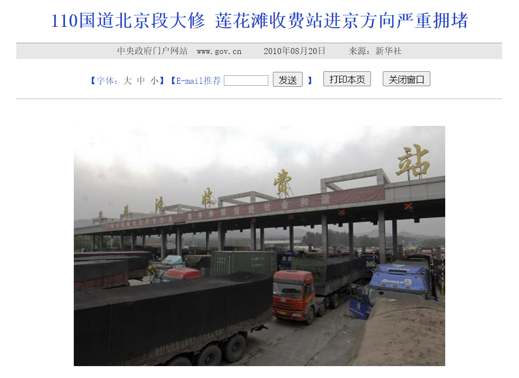 中国政府网转发的新华社发布于2010年8月20日的消息稿亦有交叉印证,称8月19日起,110国道北京段开始大修,预计持续到9月中旬。受大修影响,110国道进京方向莲花滩收费站拥堵严重,尽管北京市交管局公布了绕行方案并加大莲花滩收费站向110国道旧线的分流力度,堵塞情况也难以缓解。