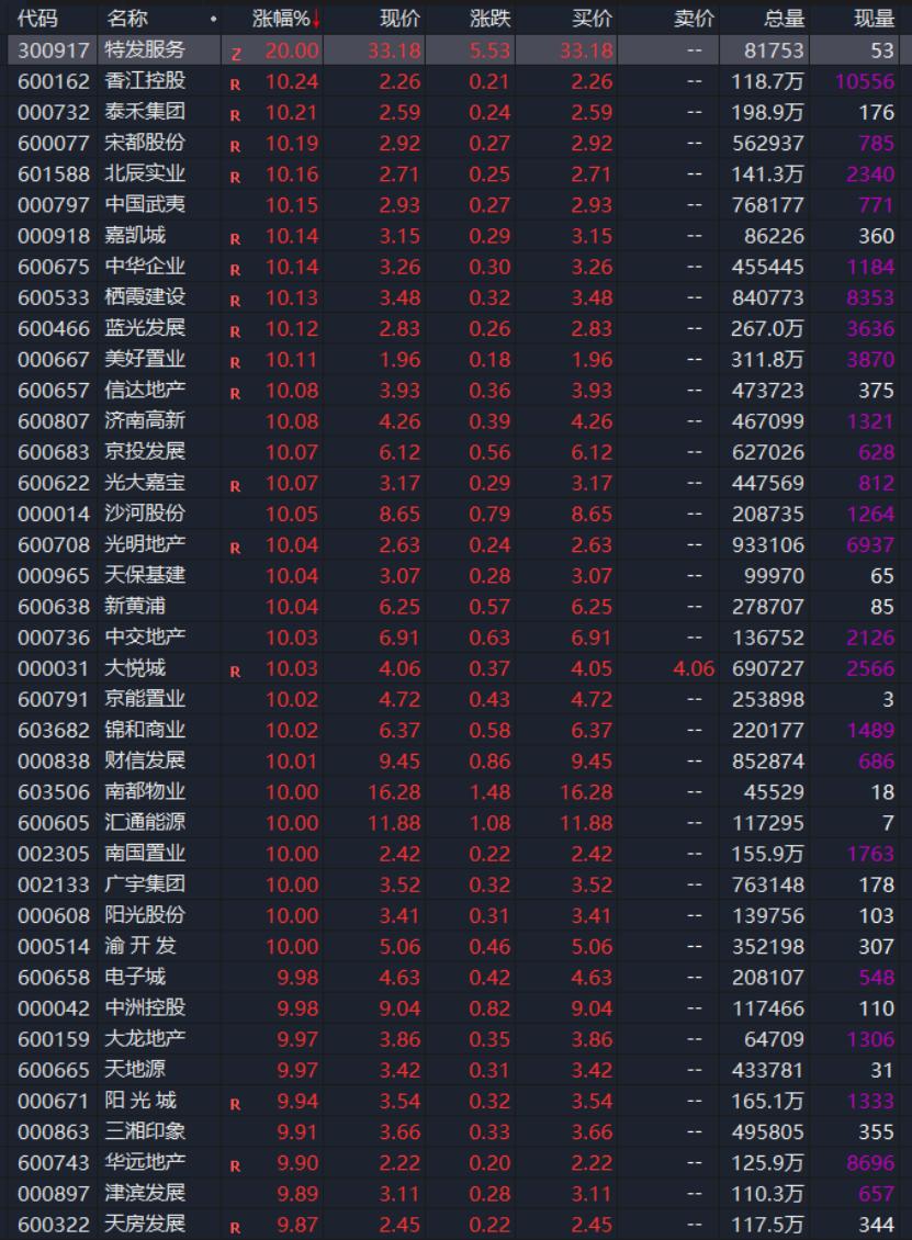 周二,房地产板块涨嗨了。其中,特发服务20CM涨停,泰禾集团、嘉凯城、蓝光发展、沙河股份、光明地产、阳光城等40股10CM涨停。