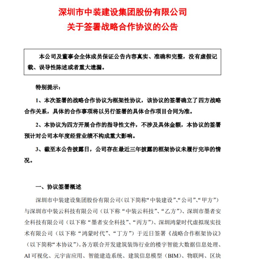 中装建设在深交所公告称,公司与深圳市中装云科技有限公司(简称“中装云科技”)、深圳市墨者安全科技有限公司、深圳鸿蒙时代虚拟现实技术有限公司(简称“鸿蒙时代”)于近日签署《战略合作框架协议》。