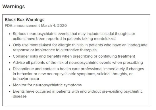 然而,美国食品药品监督管理局(FDA)于2020年3月4日,对孟鲁司特钠药品说明书进行了“黑框警告”(如下图2):孟鲁司特钠可诱发严重神经精神不良事件,建议限制其用于过敏性鼻炎的治疗。