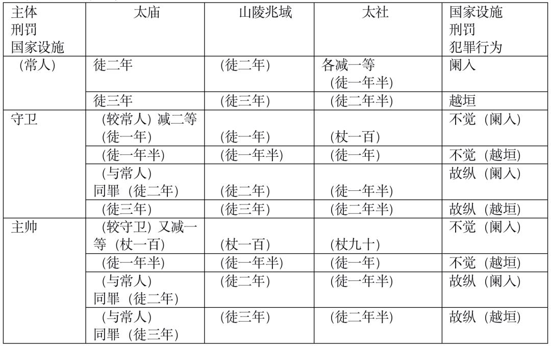 首先,省略与合并同类项的运用。以下通过一个分则条文——《阑入庙社及山陵兆域门》条,对唐律疏议的体系化技术加以分析。该条文如下:“诸阑入太庙门及山陵兆域门者,徒二年;越垣者,徒三年。太社,各减一等。守卫不觉,减二等;主帅又减一等。故纵者,各与同罪。”如果将侵害三种国家设施(太庙、山陵兆域、太社)的犯罪行为,按照“‘犯罪主体’以何种‘犯罪行为’,侵害何种‘国家设施’,应处以何种‘刑罚’”的法律规范表述模式,该条文包含了三十罪名与相应的刑罚。如下表所列: