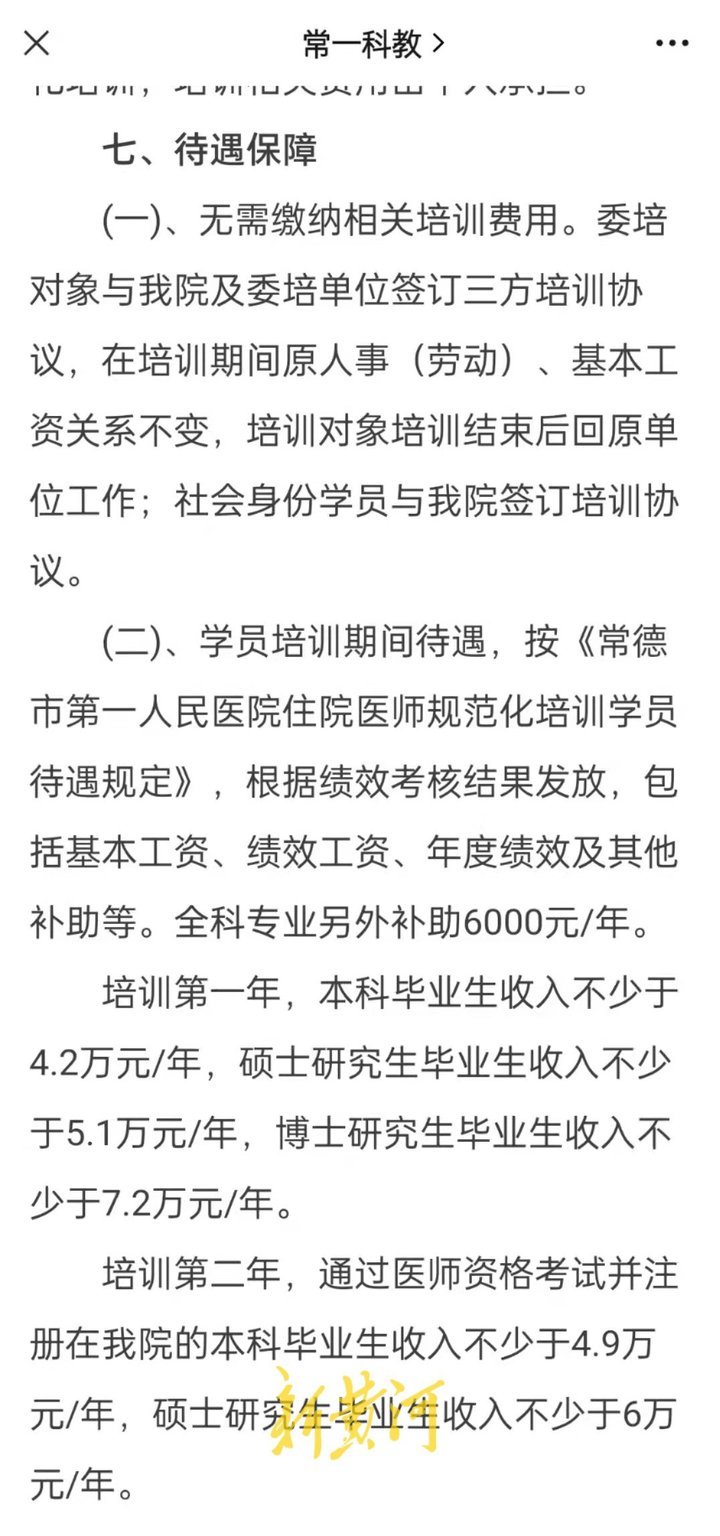 而在《2020年常德市第一人民医院住院医师规范化培训招生简章》的待遇保障一项中显示,学员培训期间待遇,按《常德市第一人民医院住院医师规范化培训学员待遇规定》,根据绩效考核结果发放,包括基本工资、绩效工资、年度绩效及其他补助等。全科专业另外补助6000元/年。培训第一年,本科毕业生收入不少于4.2万元/年,硕士研究生毕业生收入不少于5.1万元/年,博士研究生毕业生收入不少于7.2万元/年。培训第二年,通过医师资格考试并注册在该院的本科毕业生收入不少于4.9万元/年,硕士研究生毕业生收入不少于6万元/年。培训第三年,通过医师资格考试并注册在该院的本科毕业生收入不少于5.2万元/年,硕士研究生毕业生收入不少于6.3万元/年。