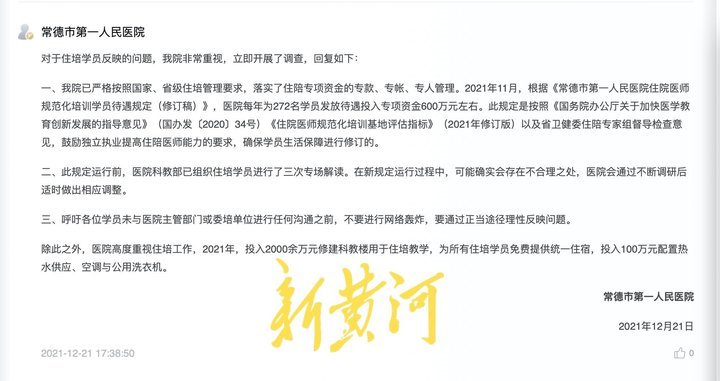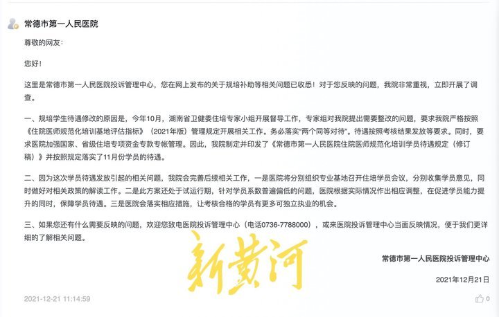 21日,新黄河记者联系到常德市第一人民医院科教部,一位工作人员表示仍在开会讨论如何解决这件事。在红网的投诉留言区,也有网友发布了相关内容,常德市第一人民医院在21日多次给出回复:因为这次学员待遇发放引起的相关问题,我院会完善后续相关工作,一是医院将分别组织专业基地召开住培学员会议,分别收集学员意见,同时做好对相关政策的解读工作。二是此方案还处于试运行期,针对学员系数普遍偏低的问题,医院根据实际情况作出相应调整,在促进学员能力提升的同时,保障学员待遇。三是医院会落实相应措施,让考核合格的学员有更多可独立执业的机会。在另一则回复中还表示:此规定运行前,医院科教部已组织住培学员进行了三次专场解读。在新规定运行过程中,可能确实会存在不合理之处,医院会通过不断调研后适时做出相应调整。