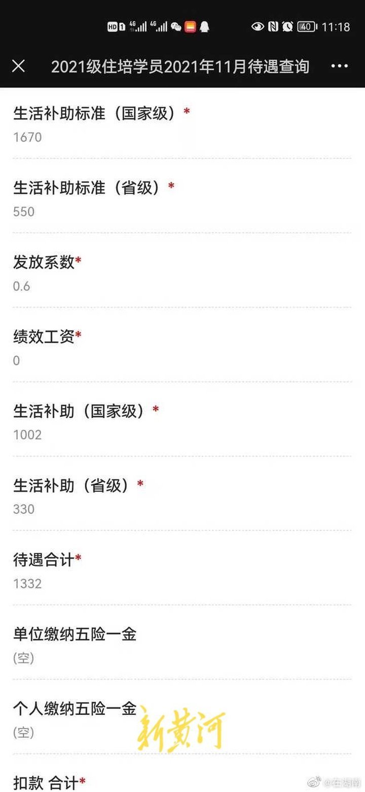 12月17日,李凡刚刚收到了11月份的收入,不足2000元。某医学院本科毕业的李凡是2020年9月通过招生进入常德市第一人民医院进行住院医师规范化培训,对于这样的收入,李凡表示这是所在医院“规培医生”的常态。而网上公布的常德市第一人民医院2021级住培学员补助条显示:每个月国家级和省级生活补助分别为1670元和550元,发放系数为0.6,待遇合计为1332元。