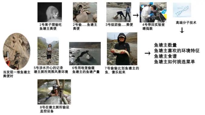 那么如何用粪便作为线索研究水獭呢?首先,用粪便数量来探索它们对栖息地的喜好,收集各种环境因子,来看看是什么特征的环境让他们选择在此踏足;在它反复排便的粪堆处安装现代化监控设备,拉了多久,几只个体干的,来的频次如何,有没有和谁发生冲突,谁偷吃了它的粪便;把粪便采集回去,用分子生物学技术进行分析,看每个样本属于哪个个体,今天吃了啥,喜欢吃啥。这就是通过粪便偷窥水獭生活的途径。