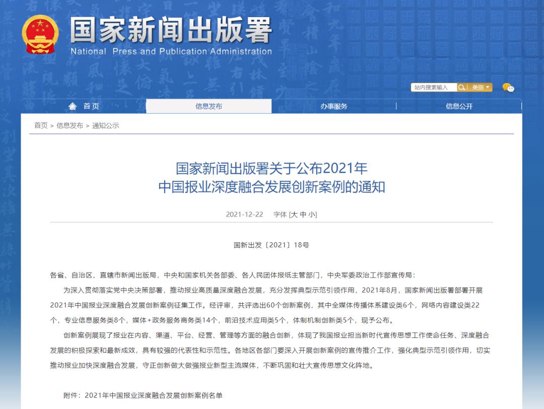 国家新闻出版署关于公布2021年中国报业深度融合发展创新案例的通知