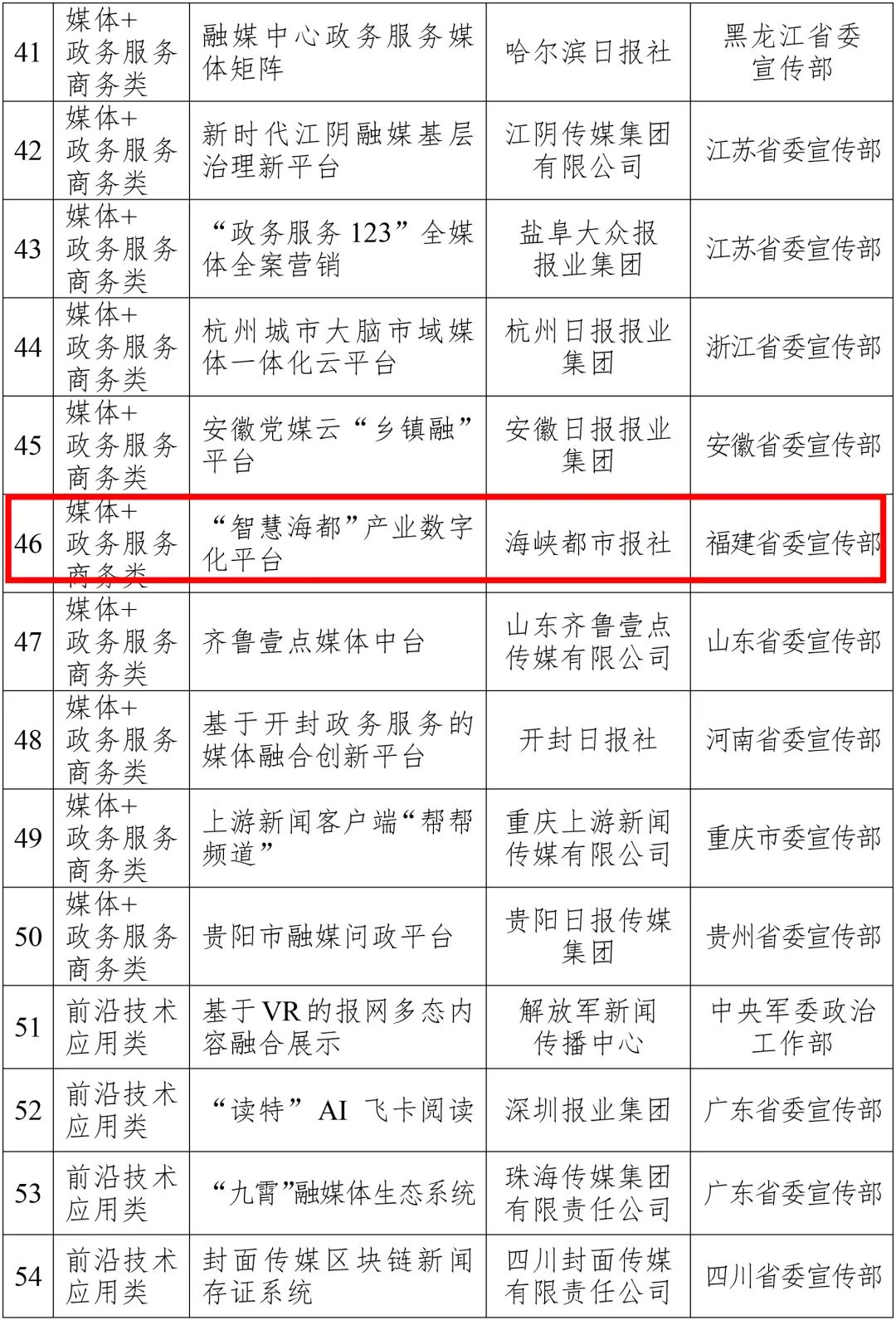 为深入贯彻落实党中央决策部署,推动报业高质量深度融合发展,充分发挥典型示范引领作用,2021年8月,国家新闻出版署部署开展2021年中国报业深度融合发展创新案例征集工作。经评审,共评选出60个创新案例,其中全媒体传播体系建设类6个,网络内容建设类22个,专业信息服务类8个,媒体+政务服务商务类14个,前沿技术应用类5个,体制机制创新类5个,现予公布。