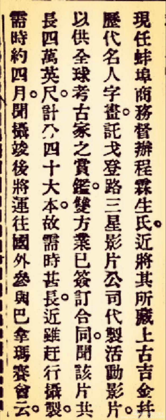 1925年3月25日《新闻报》上有则消息称:“现任蚌埠商务督办程霖生氏。近将其所藏上古吉金并历代名人字画。托戈登路三星影片公司代制活动影片。以供全球考古家之赏鉴。”