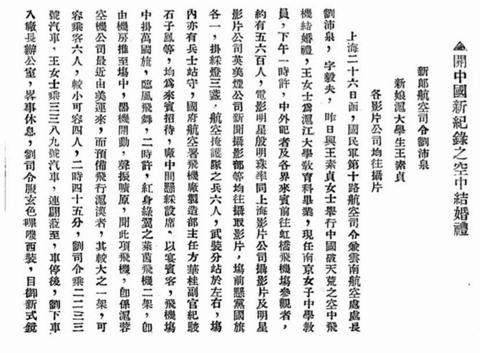 1929年12月31日《飞行月刊》消息:“国民军第十路航空司令兼云南航空处处长刘沛泉,字毅夫,昨日与王素贞女士举行中国破天荒之空中飞机结婚礼,王女士为沪江大学教育科毕业,现任南京女子中学教员,下午一时许,中外记者及各界来宾前往虹桥飞机场参观者,约有五六百人,电影明星殷明珠率同上海影片公司摄影师及明星影片公司英美烟公司新闻摄影部等均往摄取影片……”