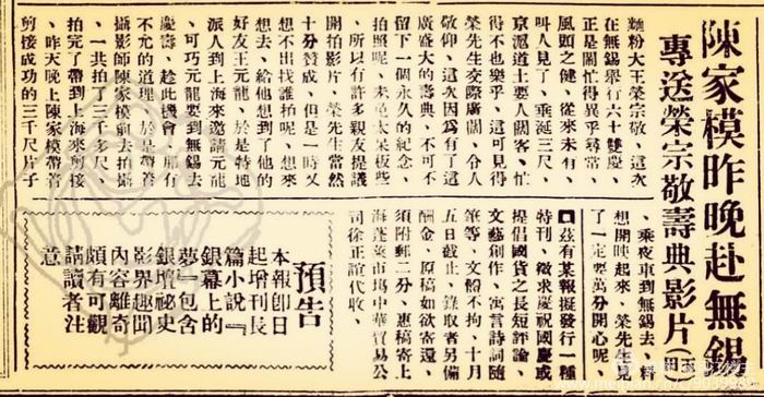 1932年9月10日《影戏生活》发布消息云:“面粉大王荣宗敬、这次在无锡举行六十双庆、正是闹忙得异乎寻常、风头之健、从来未有、叫人见了、垂涎三尺、京沪道上要人阔客、忙得不也乐乎、这可见得荣先生交际广阔、令人敬仰、这次因为有了这广盛大的寿典、不可不留下一个永久的纪念、拍照呢、未免太呆板些、所以有许多亲友提议开拍电影、荣先生当然十分赞成、但是一时又想不出找谁拍呢、想来想去、给他想到了他的好友王元龙、于是特地派人到上海来邀请元龙、可巧元龙要到无锡去庆寿、趁此机会、那有不允的道理、于是带着摄影师陈家模前去拍摄、一共拍了三千多尺、拍完了带到上海来剪接、昨天晚上陈家模带着剪接成功的三千尺片子、乘夜车到无锡去、料想开映起来、荣先生见了一定要万分开心呢。”