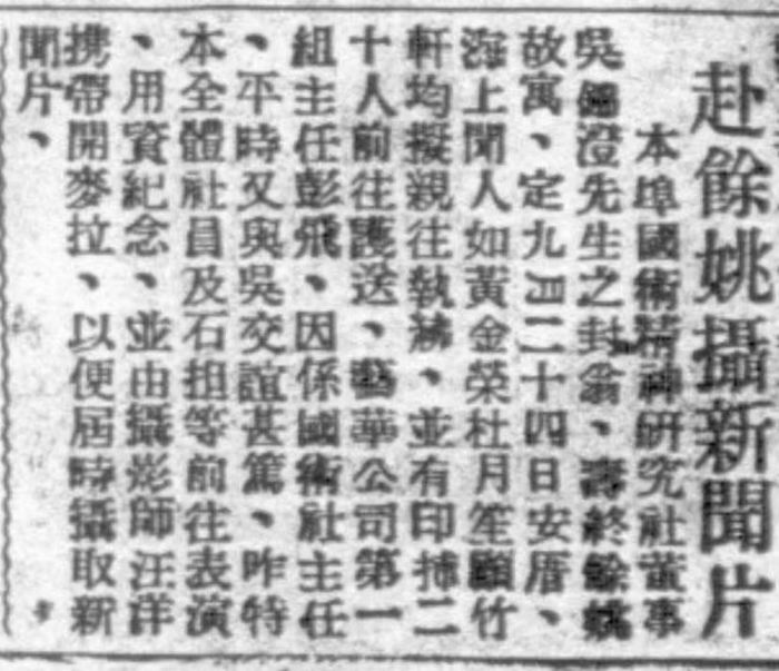 1933年9月20日《民报》消息:“本埠国术精神研究社董事吴锦澄先生之封翁、寿终余姚故寓、定九月二十四日安厝、海上闻人如黄金荣杜月笙顾竹轩均拟亲往执绋、並有印捕二十人前往护送、艺华公司第一组主任彭飞、因系国术社主任、平时又与吴交谊甚笃、昨特本全体社员及石担等前往表演、用资纪念、並由摄影师汪洋携带开麦拉、以便届时摄取新闻片。”