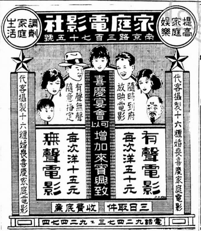 1934年11月5日《新闻报本埠附刊》上家庭电影社广告也称:“提高家庭娱乐 调剂家庭生活 喜庆宴会可以增加来宾兴致 代客摄制十六糎婚丧喜庆家庭电影 随时到府放映电影 有声无声随意指定 有声电影每次洋五十元 无声电影每次洋十五元 三日取件 收费底廉”。