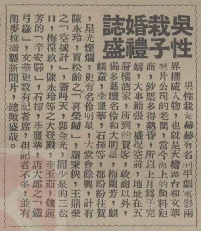 1948年5月1日《青青电影》消息:“吴性栽是赫赫有名的平剧电影两界权威人物,也就是天蟾舞台和文华影片公司的老板,当今海上的颜料巨商,钞票多得热昏,所以上月为子完姻,大事铺张,盛况空前,地址在五层楼酒家,所到的贺客,政商以外,独多艺坛名伶和大明星,梅兰芳,麒麟童,李丽华,石挥等,都纷纷往贺,星光灿烂,更有名伶明星,大堂会余兴,计有陈永玲,贾松龄之《喜荣归》,庞秉侠,王鼎奎之《空城计》,盖叫天,郭金光,阎少泉的《三岔口》,梅葆玖,陈永玲等之《大登殿》,李玉茹,魏莲芳的《辛安驿》,石挥,李丽华,唐大郎之《铁弓缘》,文华更设有记者席,但记者不多,並有开麦拉摄制新闻片,懿欤盛哉。”