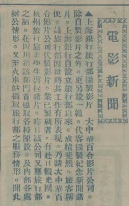 1926年11月4日《电影画报》刊登的一则报道:“大中华百合影片公司。除自制影片之外。更另设一组。代客摄制纪念新闻诸片。上海银行自设立旅行部以来。成绩斐然。旅客称便。该旅行部因欲将其工作有所表现。乃请大中华百合影片公司代制影片。业已制就者。有赴日观光团。杭州旅行旅美学生启程诸片……”