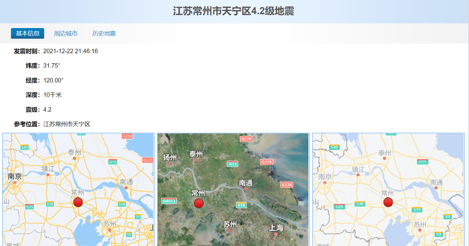 12月22日晚,@上海市地震局发布消息,中国地震台网正式测定:12月22日21时46分,在江苏常州市天宁区(北纬31.76度,东经120.0度)发生4.2级地震,震源深度10公里,距人民广场149公里。