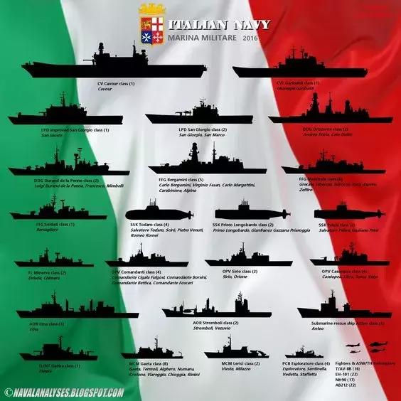2016年的意大利海军主要舰艇虽然欧美强国都不愿意离开“拥挤”的地中海,但意大利海军却是唯一只立足于地中海海区的强势海军。美国的第6舰队,并不可能在平日维持巨大的常备兵力。英国人则已经不再管理马耳他岛,只是在直布罗陀与塞浦路斯保持最低限度的存在。法国海军也需要不断兼顾广大海外水域的事物,无法集中精力在地中海。所以,意大利海军就成了地中海日常的支柱性力量。
