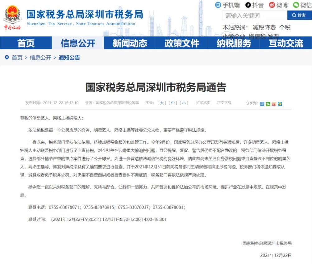 国家税务总局深圳市税务局12月22日发布通告,要求此前尚未关注自身涉税问题或自查整改不到位的明星艺人、网络主播等,抓紧对照税法及有关通知要求进行自查,并于2021年12月31日前向税务部门主动报告和纠正涉税问题,税务部门将依通知要求从轻、减轻或者免予税务处罚。