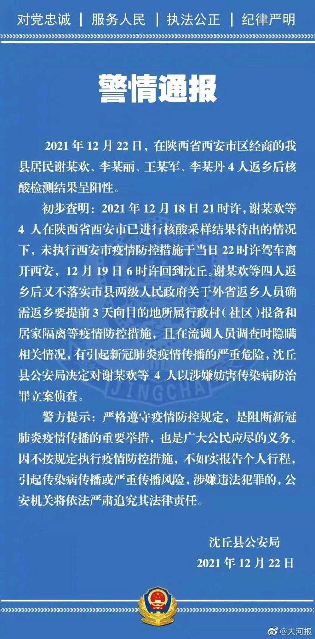 昨日,河南省周口市沈丘县疫情防控指挥部发布通告,该县在核酸检测中发现4例阳性人员,属西安自驾返沈人员。22日晚,沈丘县公安局发布通报:决定对谢某欢等4人以涉嫌妨碍传染病防治罪立案侦查。