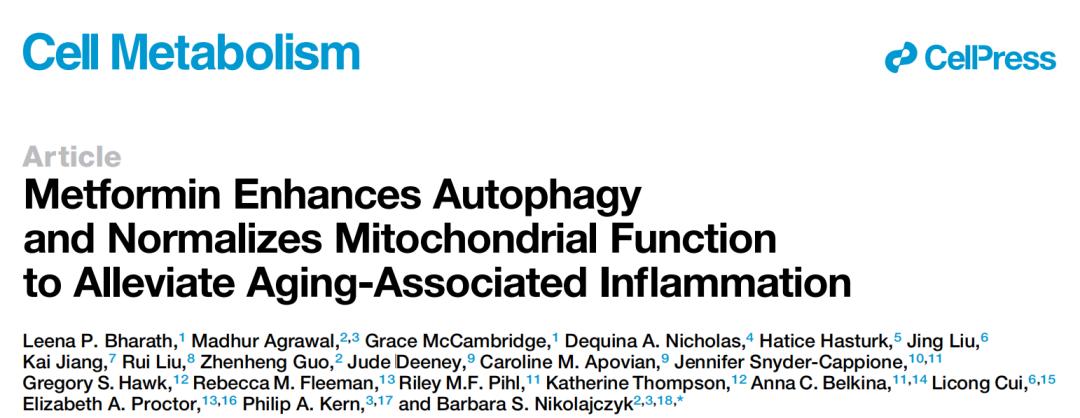 2020年5月,美国肯塔基大学和梅里马克大学等研究机构的研究人员在 Cell 子刊 Cell Metabolism 发表了题为:Metformin Enhances Autophagy and Normalizes Mitochondrial Function to Alleviate Aging-Associated Inflflammation 的研究论文。