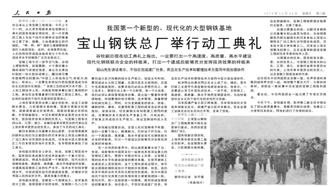 《宝山钢铁总厂举行动工典礼》报道1978年12月24日出版的《人民日报》,以《我国第一个新型的、现代化的大型钢铁基地宝山钢铁总厂举行动工典礼》为题报道宝钢开工。文章指出:高速度、高质量、高水平地建设好宝钢,对提高我国钢铁工业的生产水平、技术水平和科学管理水平,对促进我国经济的高速发展,对增进中日两国人民的友好合作,都具有重大的意义。