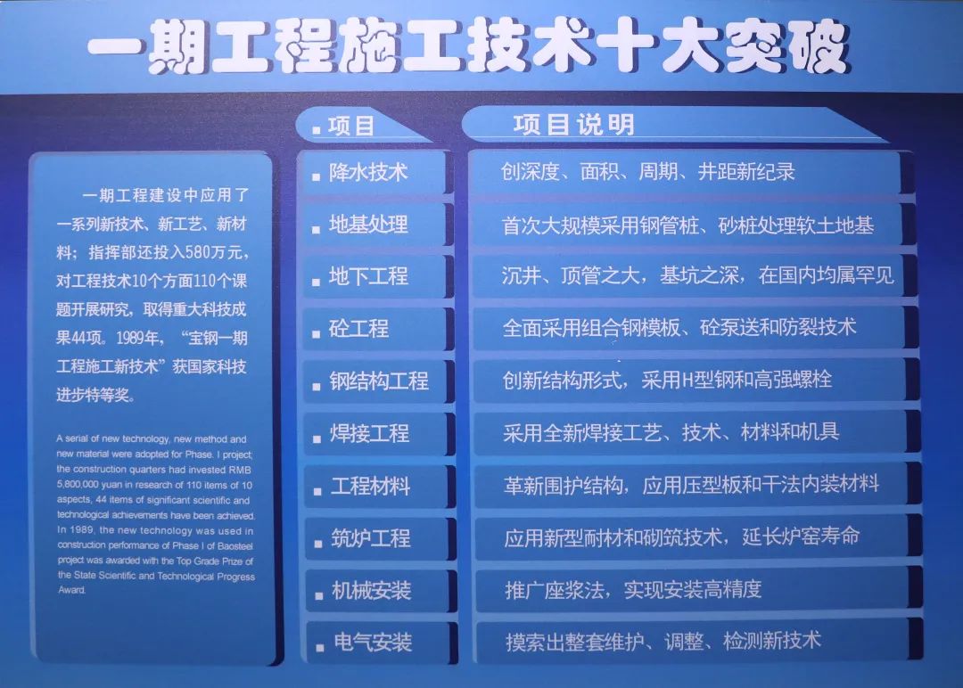 一期工程建设中应用了一系列新技术、新工艺、新材料;指挥部还投入580万元,对工程技术10个方面110个课题开展研究,取得重大科技成果44项。邓小平同志视察宝钢建设