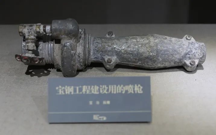 邓小平同志在宝钢接见宝钢和各施工单位领导以及劳动模范代表。宝钢工程建设使用的喷枪