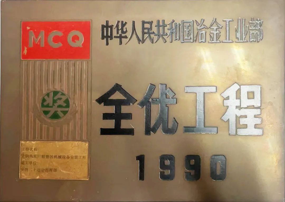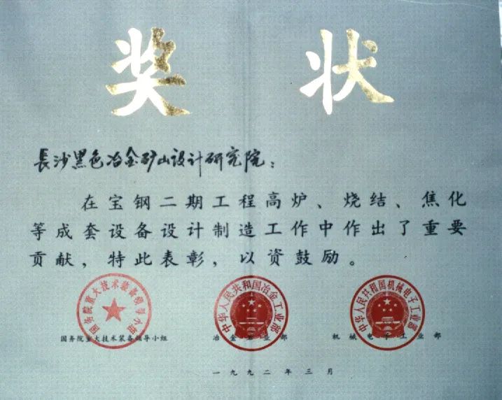 宝钢二期工程高炉、烧结、焦化等成套设备设计制造工作获奖证书