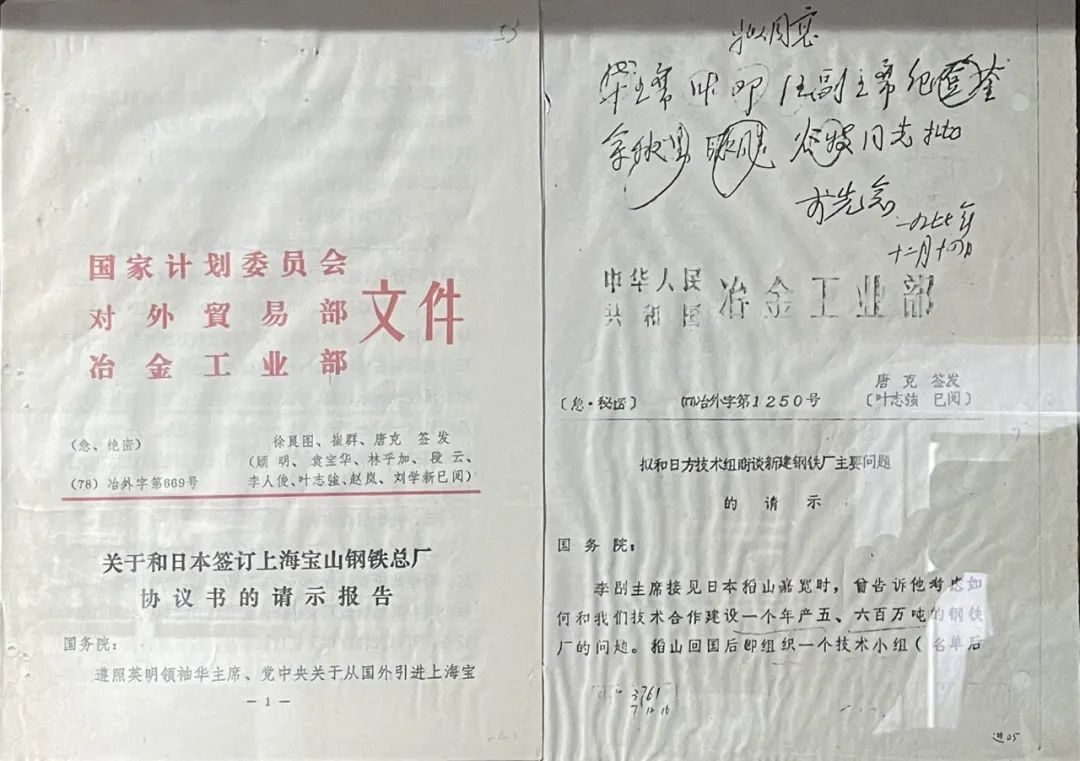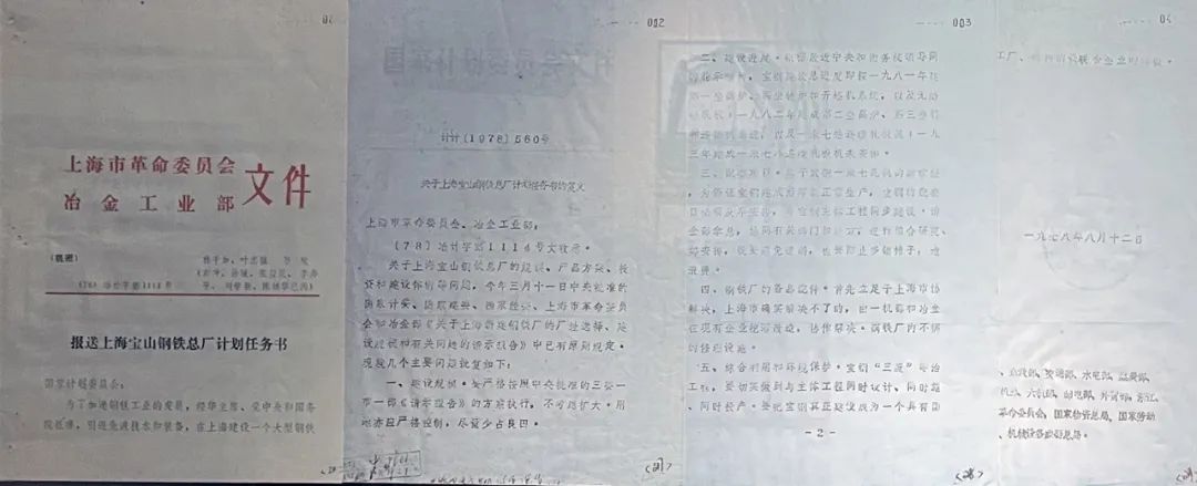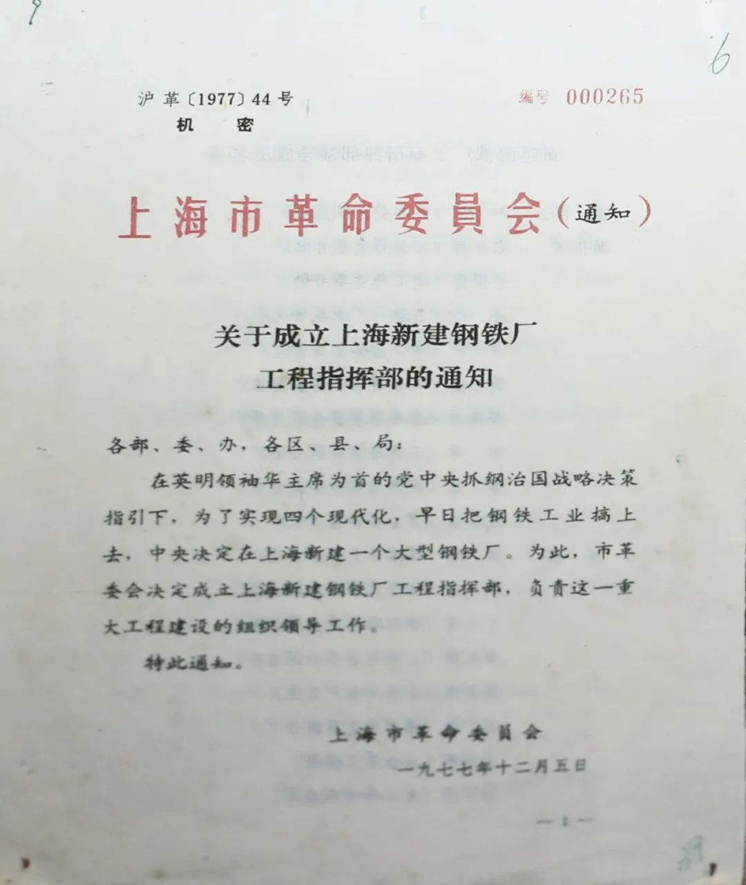 1977年末、1978年初,中共中央政治局和国务院两次讨论,作出“全套引进日本新日铁技术装备,在上海建设一座年产600万吨大型钢铁厂”的决定。《关于成立上海新建钢铁厂工程指挥部的通知》