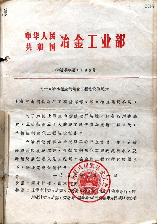 冶金部向第五冶金建设公司发出参与宝钢建设调令