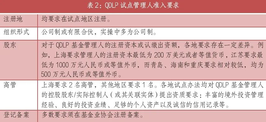 2、QDLP试点政策与准入要求现有QDLP政策主要包括准入机制、管理人准入、基金产品准入、投资者准入四个方面。从各试点地区的政策来看,有三个方面特点:第一,政策框架较为统一,均采取联席会等跨部门审核机制,准入要求均包含管理人、基金、投资者三个方面;第二,准入标准趋于统一,在管理人、基金产品、投资者方面的要求日益一致,前期试点规则较为严格,2020年后推出的试点准入要求大幅放松,因此,前期试点地区也倾向于通过修改规则或在实操中灵活掌握来放松标准,以保持竞争力;第三,准入标准趋于宽松,各地在具体准入要求上虽有一定差异,但实际门槛已经非常宽松,对于有一定实力的内外资基金管理机构来讲,达到相关标准并无难度。