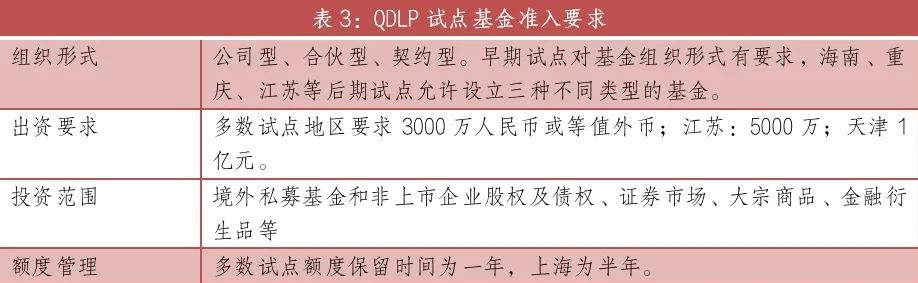 自2012年上海率先推出QDLP之后,其他多个地区陆续开始ODLP试点,2014年天津、深圳(QDIE)试点获批,2015年青岛试点获批。之后由于“控流出”管制,QDLP一度陷入停滞,直到2018年2月份才重启。北京试点于2020年获批,随后2021年海南、江苏、重庆、广东试点获批,并提高上海、北京、深圳额度至100万美元。