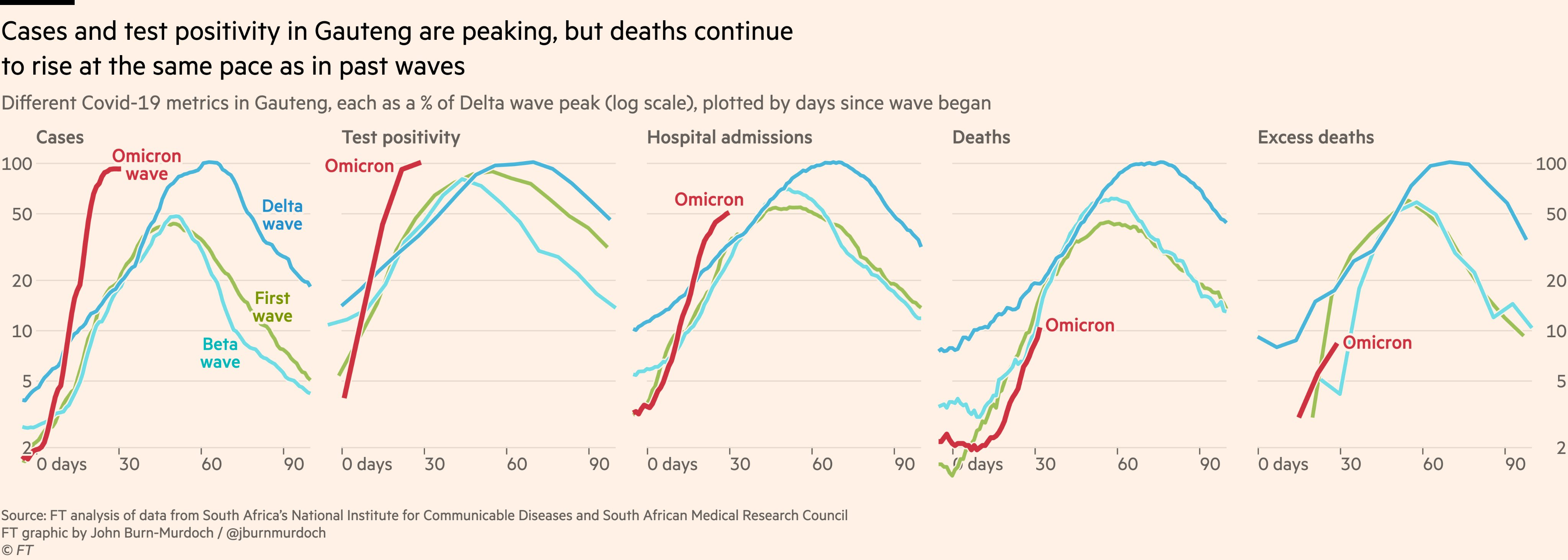 Y轴从左至右为南非豪登区的奥密克戎确诊数、检测阳性数、入院数、死亡数和额外死亡数(特定时间段内观察到的死亡人数与同一时间段内的预期死亡人数之间的差异)分别除以德尔塔流行时期对应指标的最高峰得到的百分比。奥密克戎、德尔塔、新冠病毒原始毒株和贝塔分别用红色、蓝色、绿色和蓝绿色表示。可以看到奥密克戎的确诊增速放缓,但死亡数继续升高。