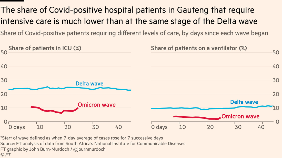 金融时报比较了德尔塔和奥密克戎变种流行初期患者的情况,其中奥密克戎患者情况采用的是南非豪登区的数据。蓝色代表德尔塔,红色代表奥密克戎。左图是进重症监护室的病人占比,可以看出德尔塔感染者进重症监护室的比例高于奥密克戎。右图是上呼吸机的病人占比,德尔塔亦高于奥密克戎。当一个变种的7日平均新增连续7天升高,认为一个变种开始流行。